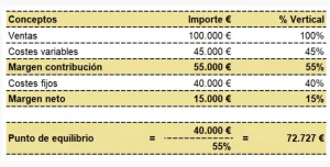 Fórmula: Punto de equilibrio = Costes fijos / (1 – % de costes variables sobre ventas)