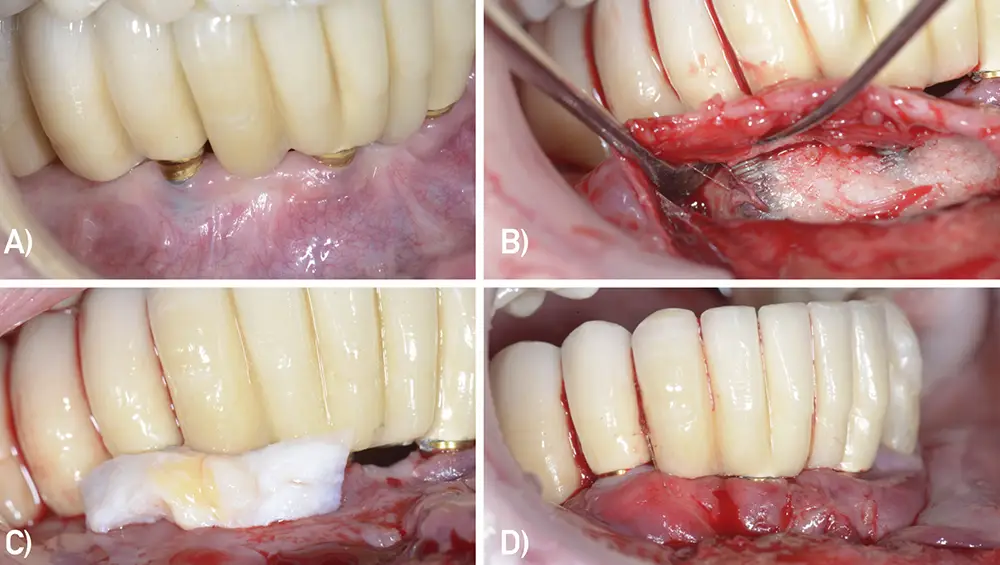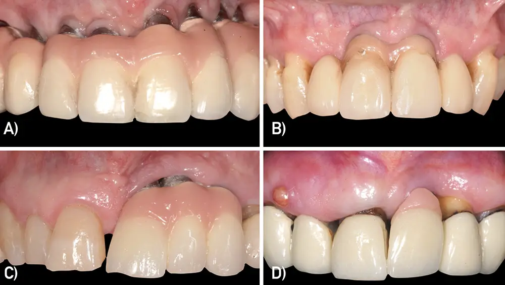 Fig.1. Diversas dehiscencias mucosas alrededor de implantes. A) Múltiples dehiscencias mucosas periimplantarias con mínima cantidad de mucosa queratinizada, inflamación y sangrado. B) Migración apical de los tejidos blandos de implantes en posición de 11 y 21 sin exposición del cuello metálico de los implantes ni de los componentes protésicos. C) Dehiscencias mucosas vestibulares en implantes asociadas a pérdida de inserción por periimplantitis. D) Migración apical de los tejidos vestibulares alrededor de un implante unitario en 21 sin exposición del cuello metálico de los implantes ni de los componentes protésicos.