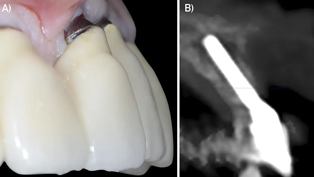 Fig. 2. Implante inclinado hacia vestibular. A) Imagen clínica de un implante con una emergencia excesivamente vestibular. B) Imagen radiográfica (3D) de un implante con una emergencia excesivamente vestibular.