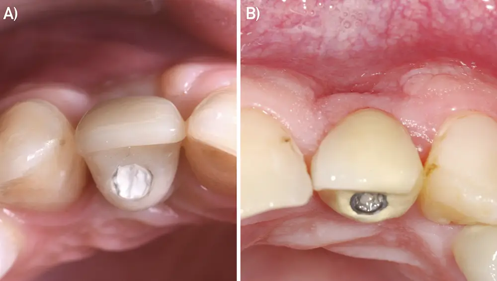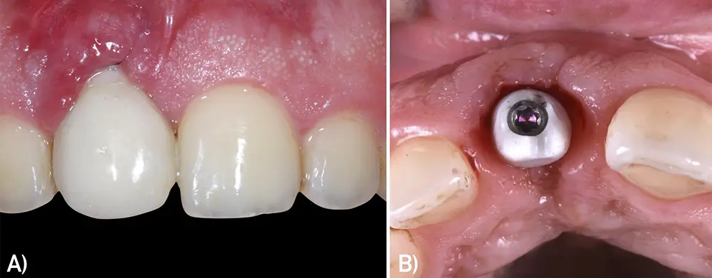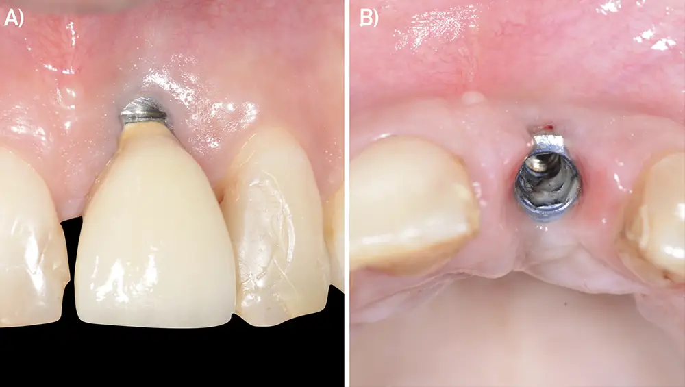 Fig. 7: Dehiscencia mucosa vestibular en implante en posición de 11. A) Situación clínica inicial. B) Retirada de la corona implantosoportada. Vista oclusal y comprobación de la posición y emergencia del implante.