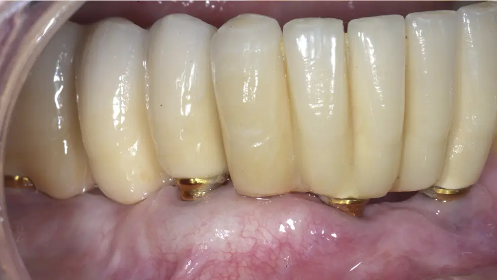 Unos años más tarde, Zucchelli y cols. propusieron un enfoque quirúrgico-protésico más integral, que incluía la modificación del pilar protésico y la aplicación de un CRC con ITC. En su estudio prospectivo, lograron una cobertura media del 96,3% al año, con cobertura completa en el 75% de los casos. Este protocolo, que requería la retirada temporal (pudiendo cambiarse por otra definitivamente) de la corona y ajustes protésicos, demostró que la combinación de cirugía plástica periimplantaria y planificación / modificación protésica podía ofrecer resultados altamente predecibles. A los cinco años, los resultados se mantenían estables, con una cobertura media del 99,2% y completa en el 79% de los casos, además de un aumento progresivo del grosor, atribuido al fenómeno de “creeping attachment” y achacable también al origen del injerto18,19.