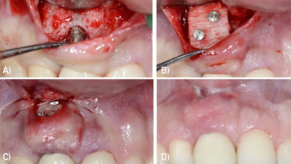 B) Fijación de lamina cortical desmineralizada de aloinjerto con microtornillos (Cortiflex® Salugraft Dental).