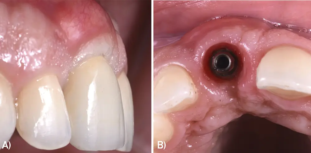 Fig. 4. Implantes con biotipo fino o grosor de mucosa queratinizada deficiente. A) Implante en 12 con una deficiencia vestibular de tejido blando por biotipo fino. B) Implante en 22 con una deficiencia vestibular de tejido blando por biotipo fino.